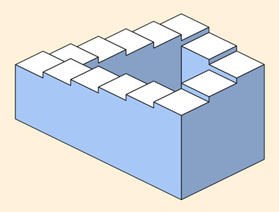The figure on the left below represents an impossible staircase, similar to one originally published by Penrose and Penrose in 19581. Since each stair that is one step clockwise from its neighbor is also one step downward, the staircase appears to be eternally descending. Our perceptual system insists on this interpretation, even though it cannot be correct.