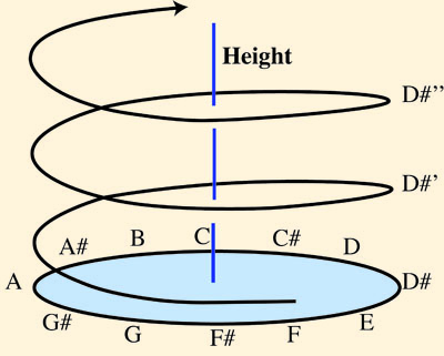 To accommodate both the linear and circular dimensions, music theorists have suggested that pitch should be represented as a helix having one complete turn per octave, so that tones that are separated by octaves are also close on this representation, as shown below.