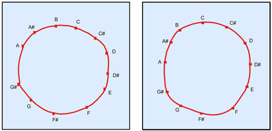 Pitch circularities are based on the same principle. By analogy with real world staircases, pitch is generally viewed as extending along a scale from low to high, as can be experienced by sweeping one’s hand up a keyboard. But pitch also has a circular component, known as pitch class. This is acknowledged in our musical scale, which is based on the circular configuration shown on the right below. As we ascend this scale in semitone steps, we repeatedly traverse the pitch class circle in clockwise direction, so that we play C, C#, D, and so on all around the circle, until we reach A, A#, B - and then we proceed to C, C#, D again, and so on.